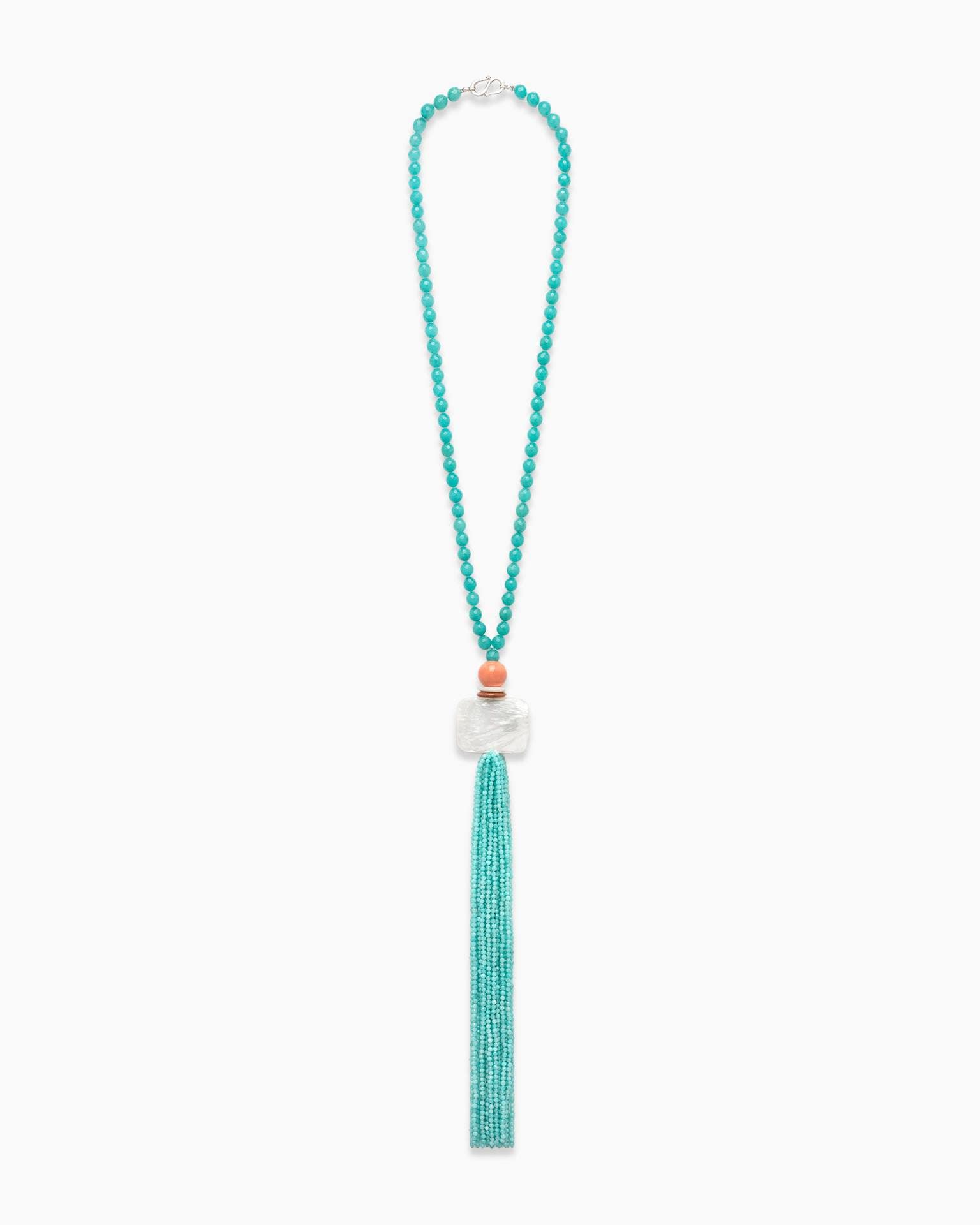 The silhouette is intentionally pared back: one long strand, one concentrated finish. Three micro details carry the character: amazonite’s milky aqua shift, the dense warmth of carnelian as a precise counterpoint, and the cool sheen of mother-of-pearl—before the tassel softly “traces” your movement. :contentReference[oaicite:9]{index=9}