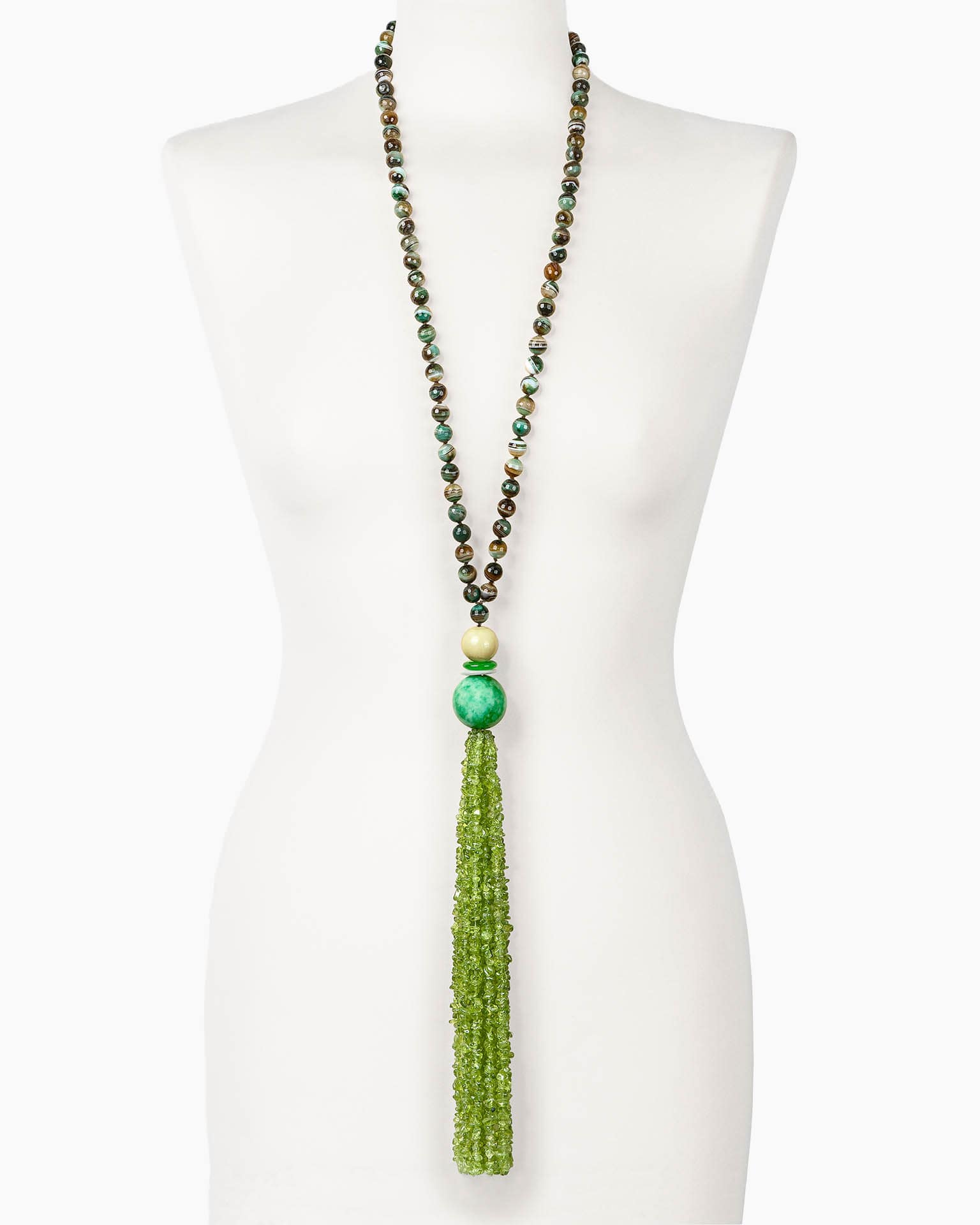Die MAGGIORE Kette ist ein Unikat-Collier, das Farbe und Licht über eine lange, klare Linie führt: Achat und Calcit bilden eine ruhige, mineralische Basis – die Peridot-Tassel setzt am Ende den lebendigen Akzent. Lang getragen wirkt es sofort wie „angezogen“, ohne dass Sie viel kombinieren müssen. :contentReference[oaicite:0]{index=0}