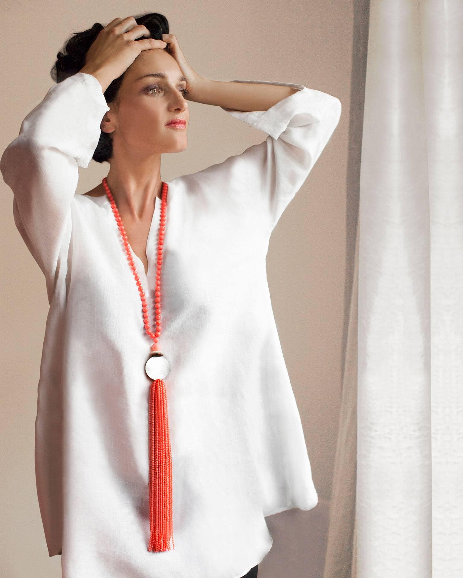 Die Silhouette bleibt bewusst reduziert, damit die Materialien den Ton angeben: Koralle als warmer Farbverlauf, Achat als mineralische Zeichnung, Perlmutt als kühler Lichtblock – und am Schluss die Tassel als einzige, weiche Bewegung. Es wirkt wie „fertig“ angezogen, ohne dekorativ zu werden.