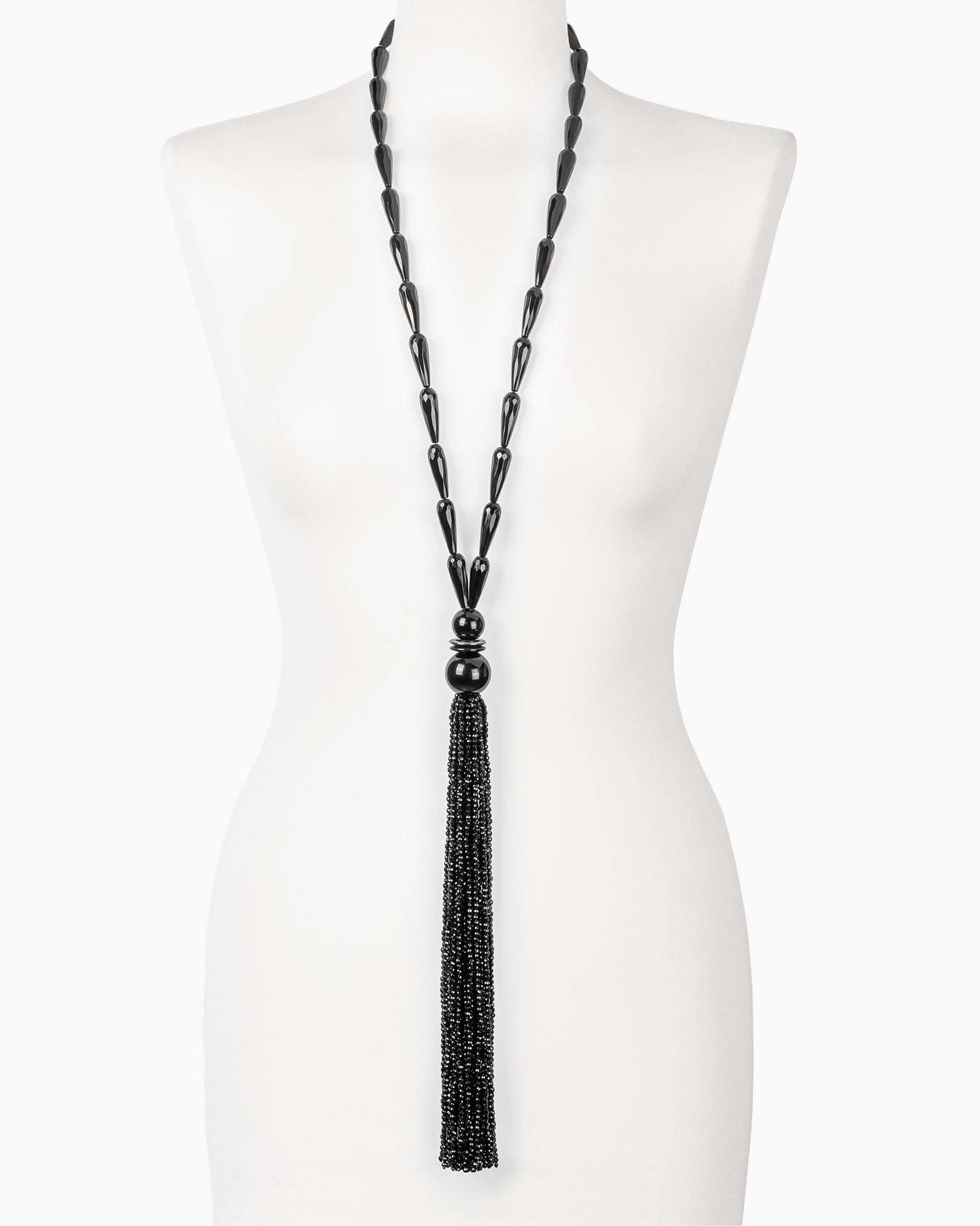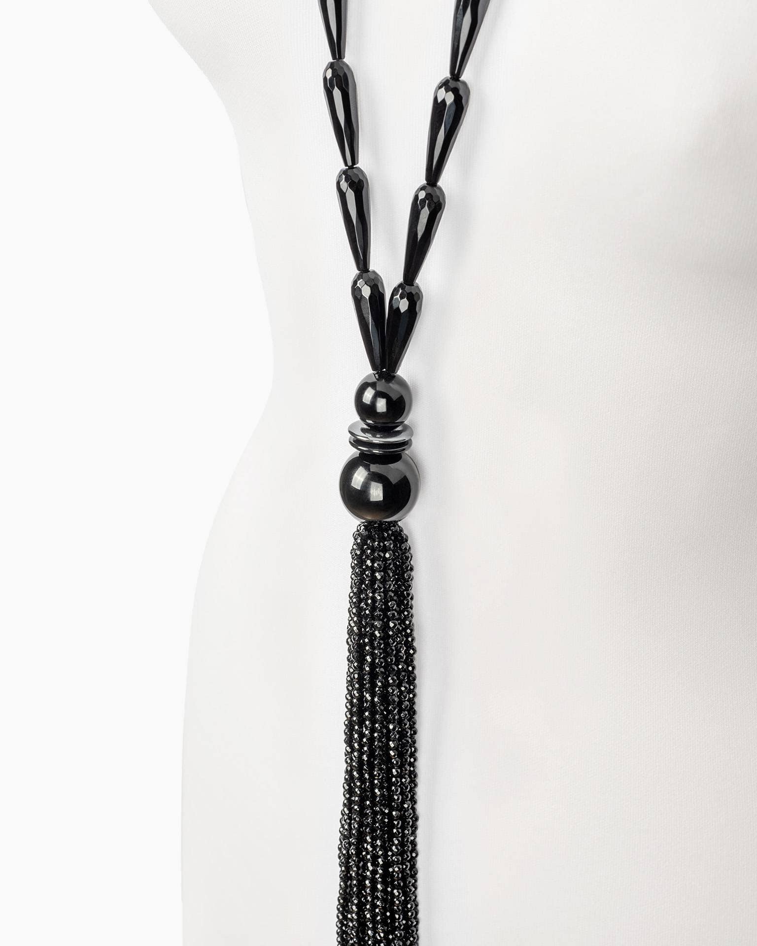 Die Silhouette ist bewusst grafisch: schlanke Onyx-Perlen als ruhige Strecke, unten der konzentrierte Abschluss mit Tassel. Drei Unikat-Mikrodetails, die den Look tragen: der spiegelnde Onyx-Glanz, die elongierte Perlenform (nicht rund, sondern straffer), und die klare Schwerpunktsetzung am Tassel-Übergang.
