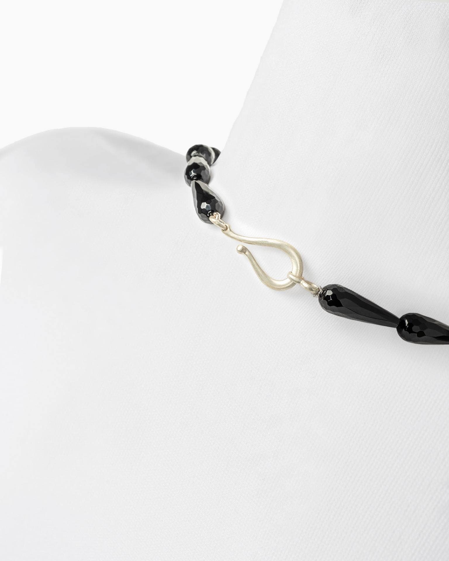 MAGGIORE ist ein Unikat-Collier, das über eine einzige, lange Linie wirkt: tiefschwarzer Onyx, klar rhythmisiert, endet in einer dunklen Tassel, die dem strengen Minimalismus Bewegung gibt. :contentReference[oaicite:1]{index=1}