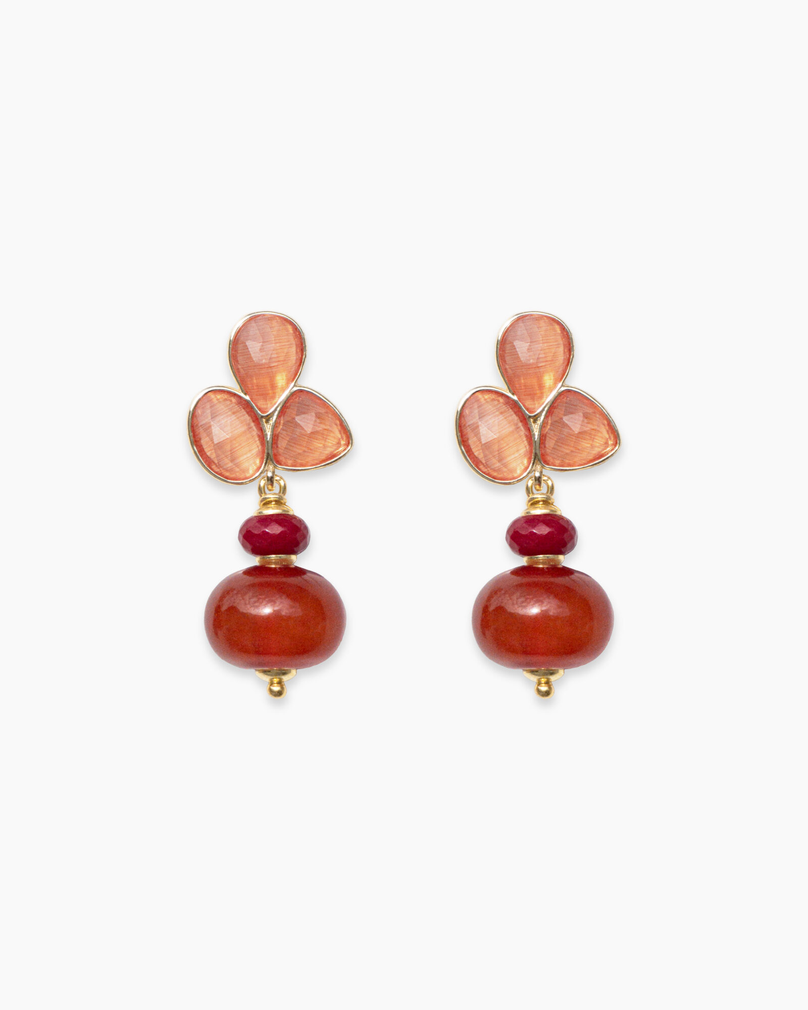 Indischer Cateye bringt eine geschlossene, feine Lichtwirkung mit. Er wirkt ruhig, präzise und fast samtig. Die Wurzelrubine setzen dazu eine tiefere, organische Farbnote, wodurch der Entwurf Substanz erhält. Der Karneol öffnet das Bild anschließend mit seinem warmen Orange-Rot und verleiht den Ohrringen mit Wurzelrubinen ihre helle, sonnige Ausstrahlung.