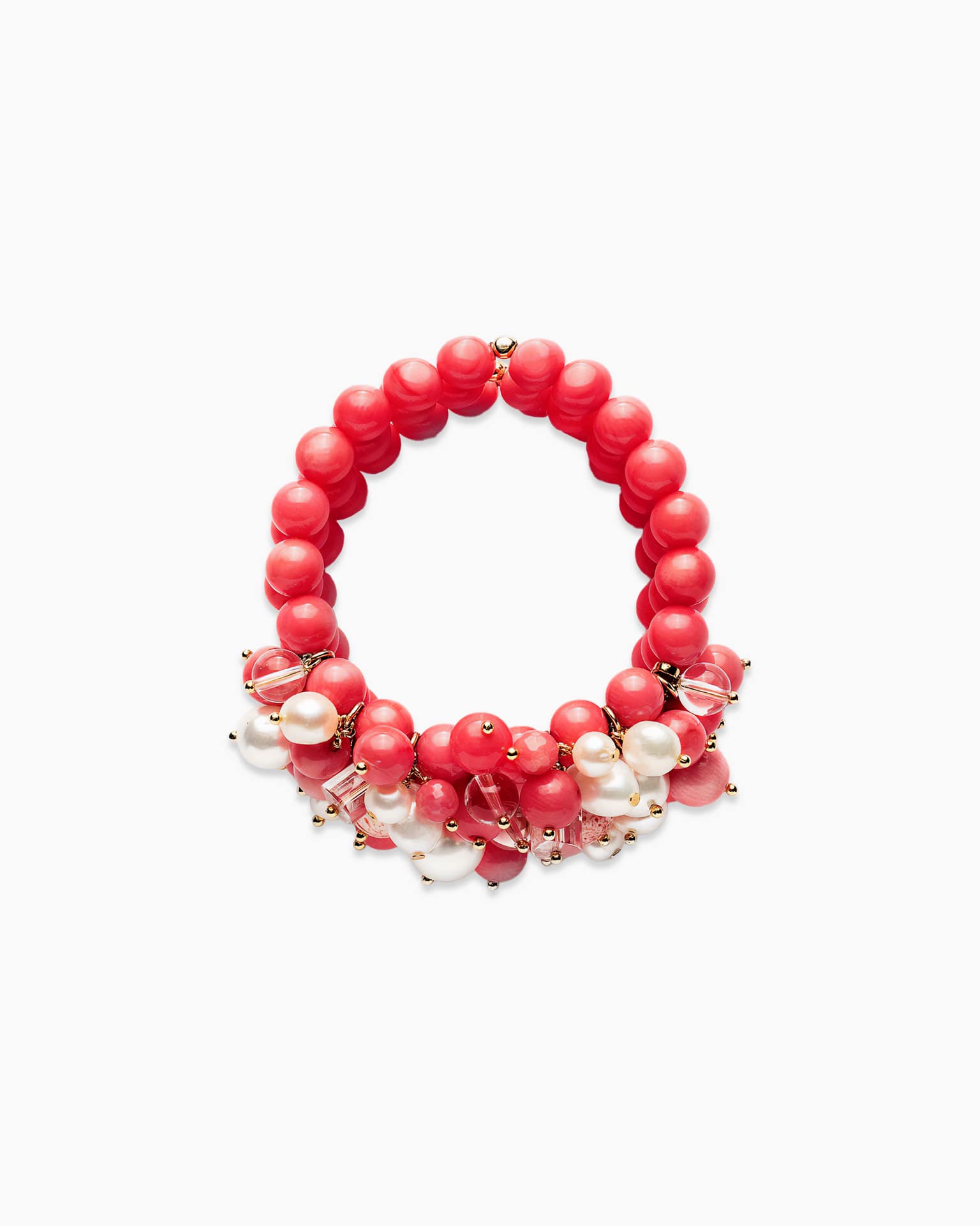 Korallen, Bergkristall und Perlen – kombiniert, damit Wärme, Transparenz und Glanz im Gleichgewicht bleiben. Der Verschluss ist aus Sterlingsilber, 18 Karat vergoldet. :contentReference[oaicite:2]{index=2}