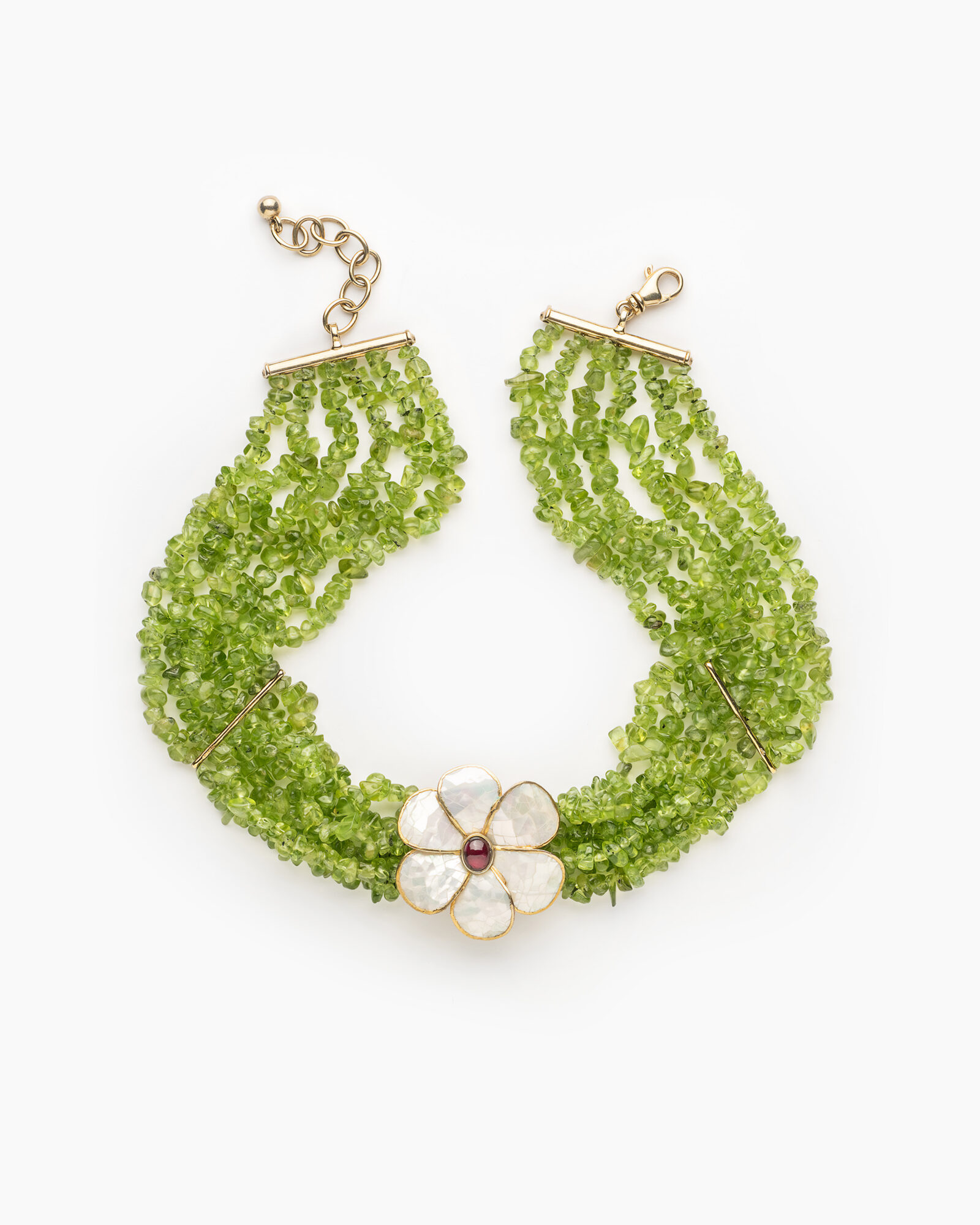 Der Vivara Choker Peridot ist ein Unikat mit heller, floraler Präsenz. Sechs Stränge aus Peridot bauen ein klares, leuchtendes Farbband auf, das durch die Perlmutt-Blüte mit Goldrand einen skulpturalen Fokus erhält. Der Rhodolith-Cabochon setzt dazu einen warmen, präzisen Kontrapunkt und verdichtet die Komposition in ihrer Mitte. Mit 33 cm Länge plus Verlängerungskette von 3 bis 5 cm sitzt der Vivara Choker Peridot nah am Hals und wirkt dadurch gesammelt, klar und deutlich im Ausdruck. Seine Breite von 5 cm gibt ihm sichtbare Präsenz, ohne schwer zu erscheinen.
